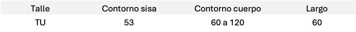 Es semi-traslúcida, la adaptabilidad de la tela permite un amplio rango de talles dentro de cada talle, adaptándose a la silueta debido a su tendencia de volver al estado original.